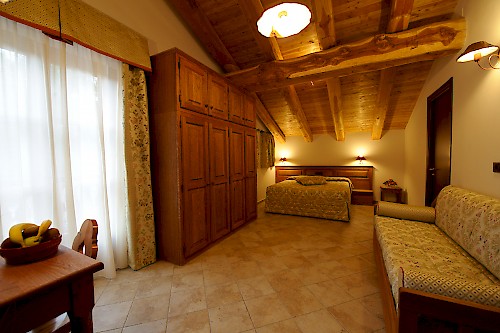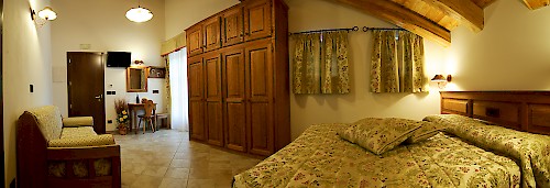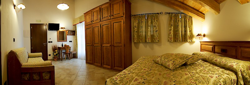 Le stanze sono arredate con uno stile che richiama la tradizione di montagna (mobili in rovere, tendaggi eleganti e ignifughi, quadri in mezzo punto) e sono dotate di bagno interno con doccia e phon, TV a schermo piatto di ultima generazione, satellitare, telefono, cassaforte e wi-fi libero.