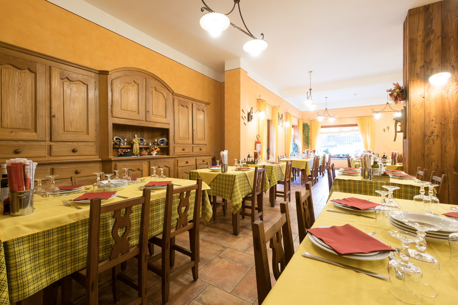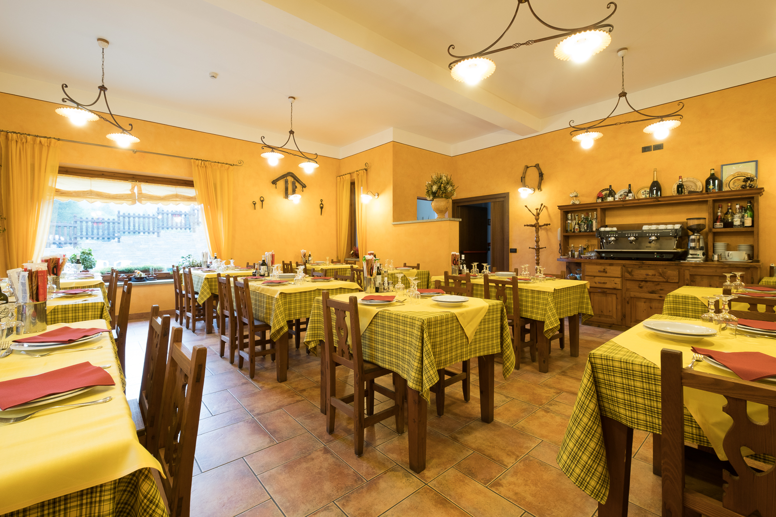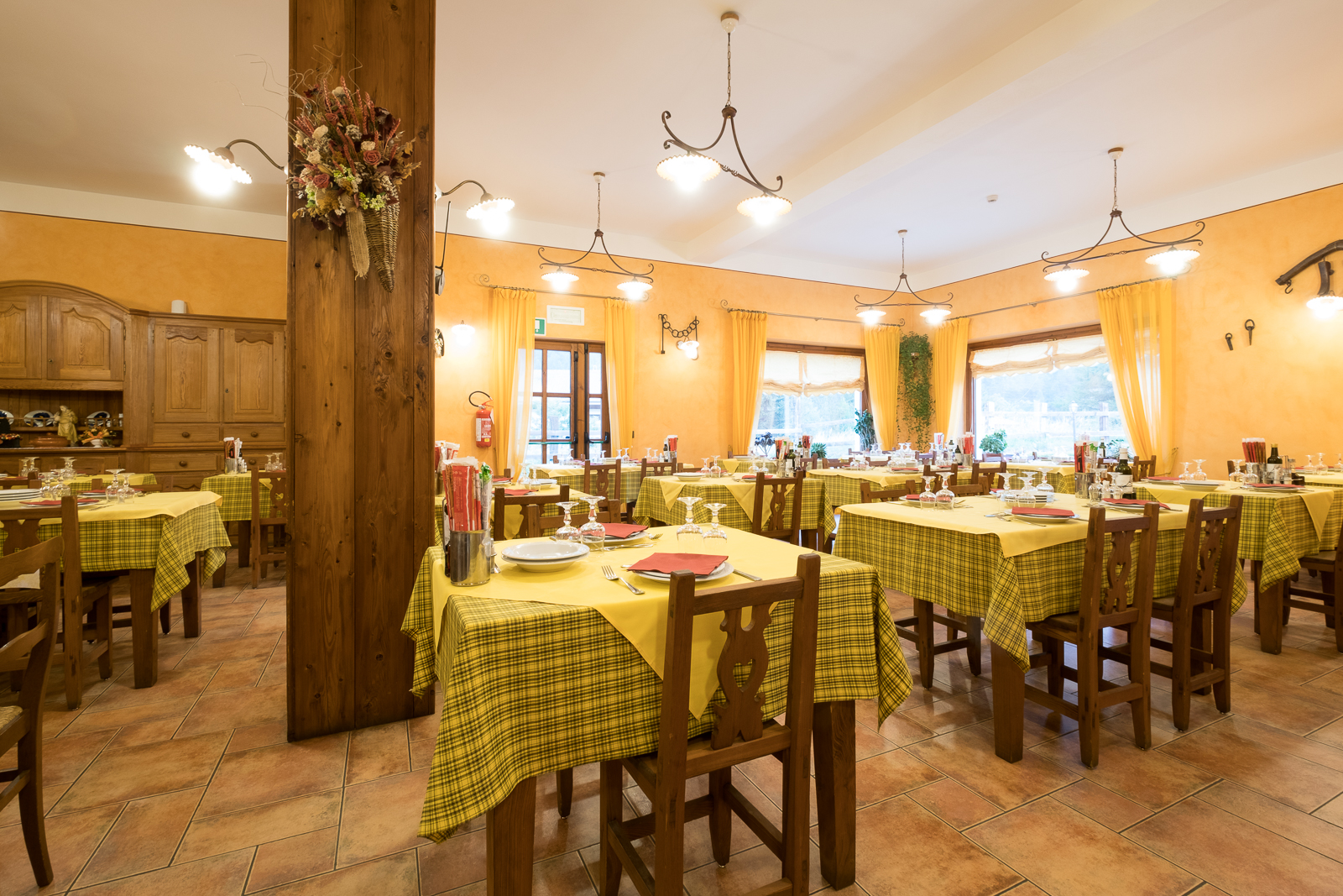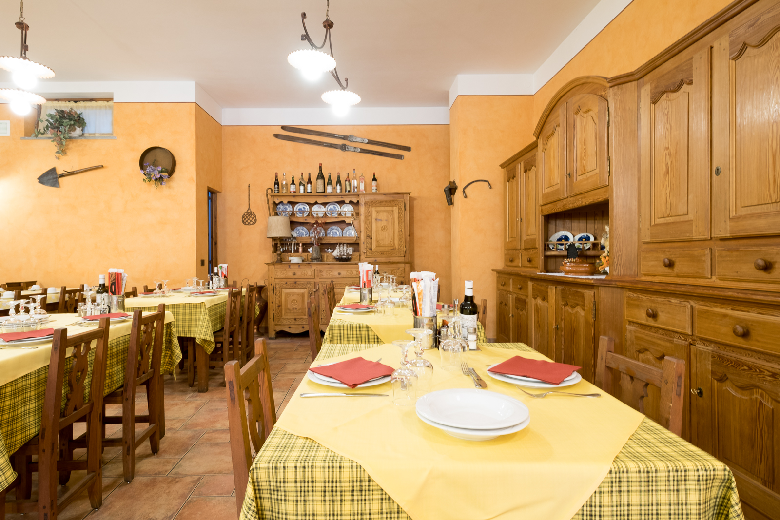 La sala pranzo, con i suoi lampadari in ferro battuto e i cappelli di terra cotta, dispone di circa 100 posti a sedere, con due enormi vetrate dalle quali si può godere di una splendida vista del monte Albergian.